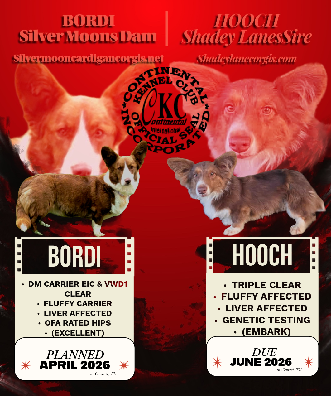 This pairing is planned for June of 2026 with the breeding taking place in April. This breeding will produce dm clear or carriers, eic & vwd1 clear. All will be liver, liver sables liver tricolors, liver brindles. This litter will have Fluffies & Fluffy carriers. Parents embarked and Bordi is OFA and Penn hip tested.