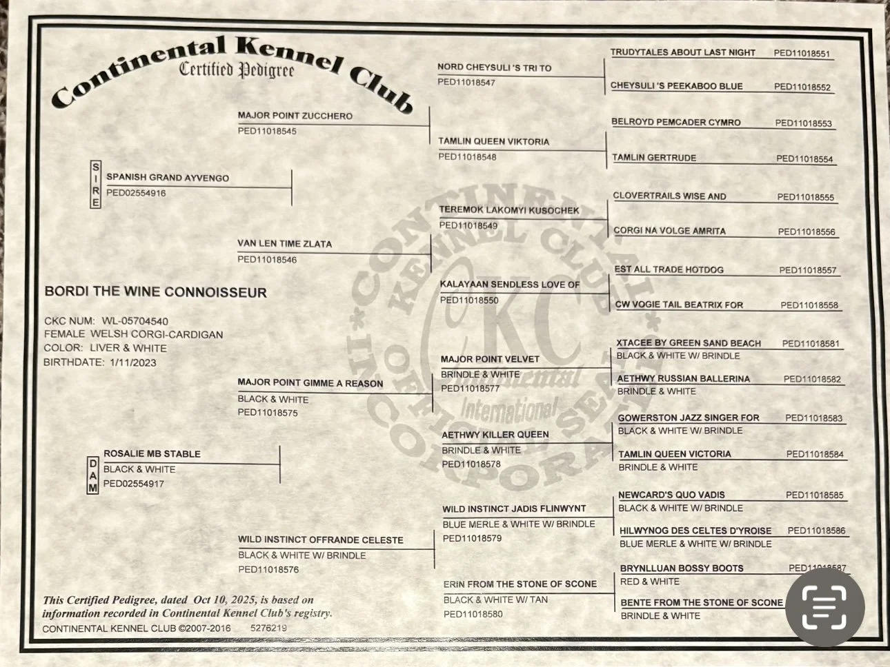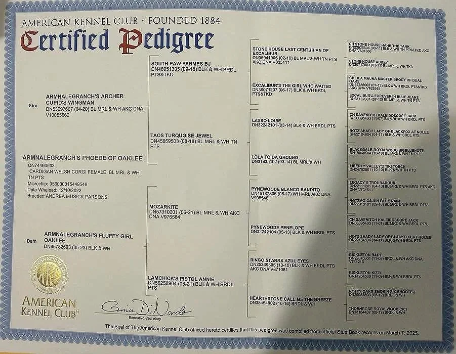 Phoebe is estimated due back into heat in November 2026. This would make her babies due in January ready to in March 2027. This litter will consist of AKC registered Cardigan Welsh Corgis, Triple clear or DM Carriers, fluffies, fluffy carriers, and fluff clear. Most will carry the Liver gene. Colorations possible include liver, liver merles, blue merles, tricolors with brindle or tan points, brindle merles, or brindles. Both parents are Embark tested and Phoebe is OFA and pennhip tested for hips and elbows, eyes will be completed prior to this breeding. Onyx is pending his pennhip & OFA testing at age one!