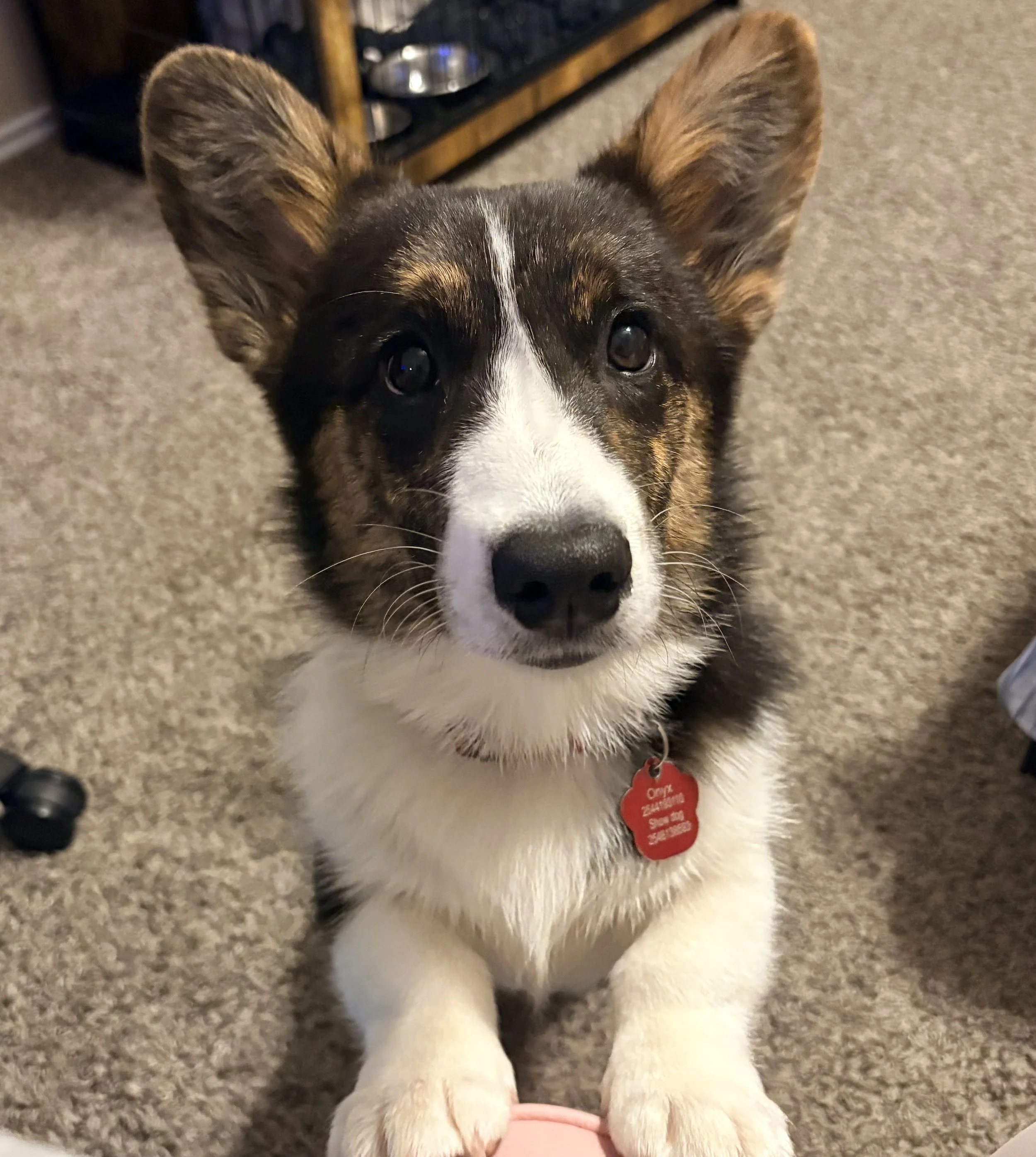 Onyx is an AKC Cardigan Welsh Corgi who is black tricolor with brindle points, DM Carrier, EIC & VWD1 clear, Carrying liver and fluffy genes. We had his first puppy show March 14th and placed third! He is the most snuggly little guy and loves his lap cuddles! OFA eyes pending apt! Pennhip and Ofa will be completed at one year of age!