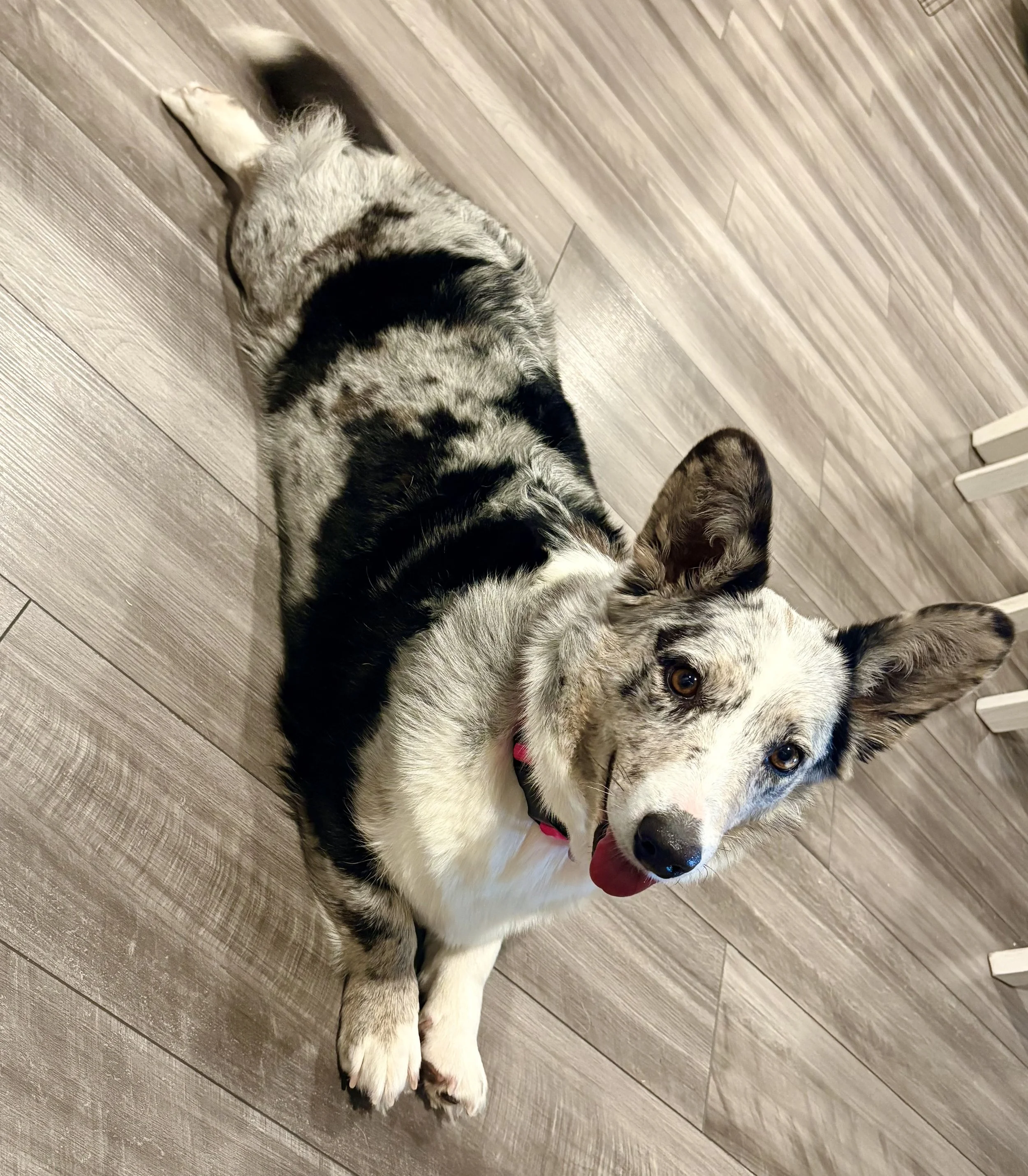 Phoebe is an AKC registered blue merle with brindle points cardigan Welsh corgi. She is triple clear, fluffy carrier and Liver carrier. She is a sweet girl with a goofy demeanor an is very vocal about getting pets! Penn hip score of 0.52, OFA rated Good on hips and Normal elbows . OFA eyes pending apt!